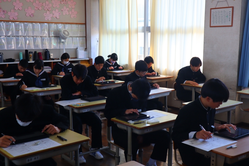 テスト2日目 2025年2月20日 16時00分 1・2年生は学年末テスト、3年生は入試直前テスト2日目です。連日のテストにも関わらず、生徒たちは集中して問題に向き合い、粘り強く取り組んでいました。寒さに負けず、最後まで自分の力を信じて頑張ってください。それぞれの努力が実を結ぶことを願っています。 学校評価アンケート(後期)について(お知らせ) 学校評価アンケートに御協力いただき、ありがとうございました。結果がまとまりましたので、「学校評価」のタブより御確認ください。いただいた御意見等を今後の教育活動の参考にさせていただきます。