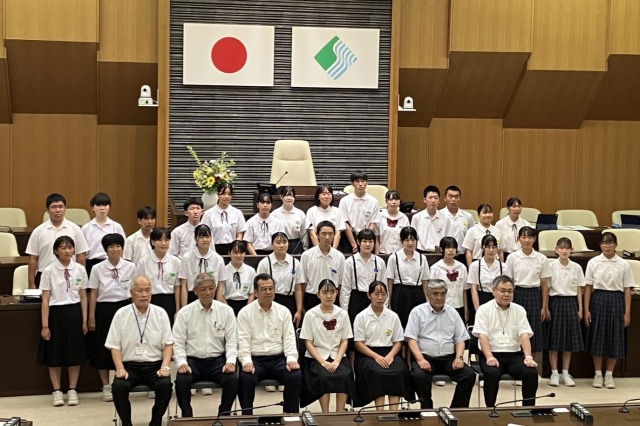 2024年8月6日 15時00分5日(月)に西条市合併20周年記念事業として、西条市中学生議会が開催され、本校から中学生議員して生徒会役員の重見さん、日野さん、藤井さん、中学生傍聴者として川又さん、小林さんの5名が参加しました。
